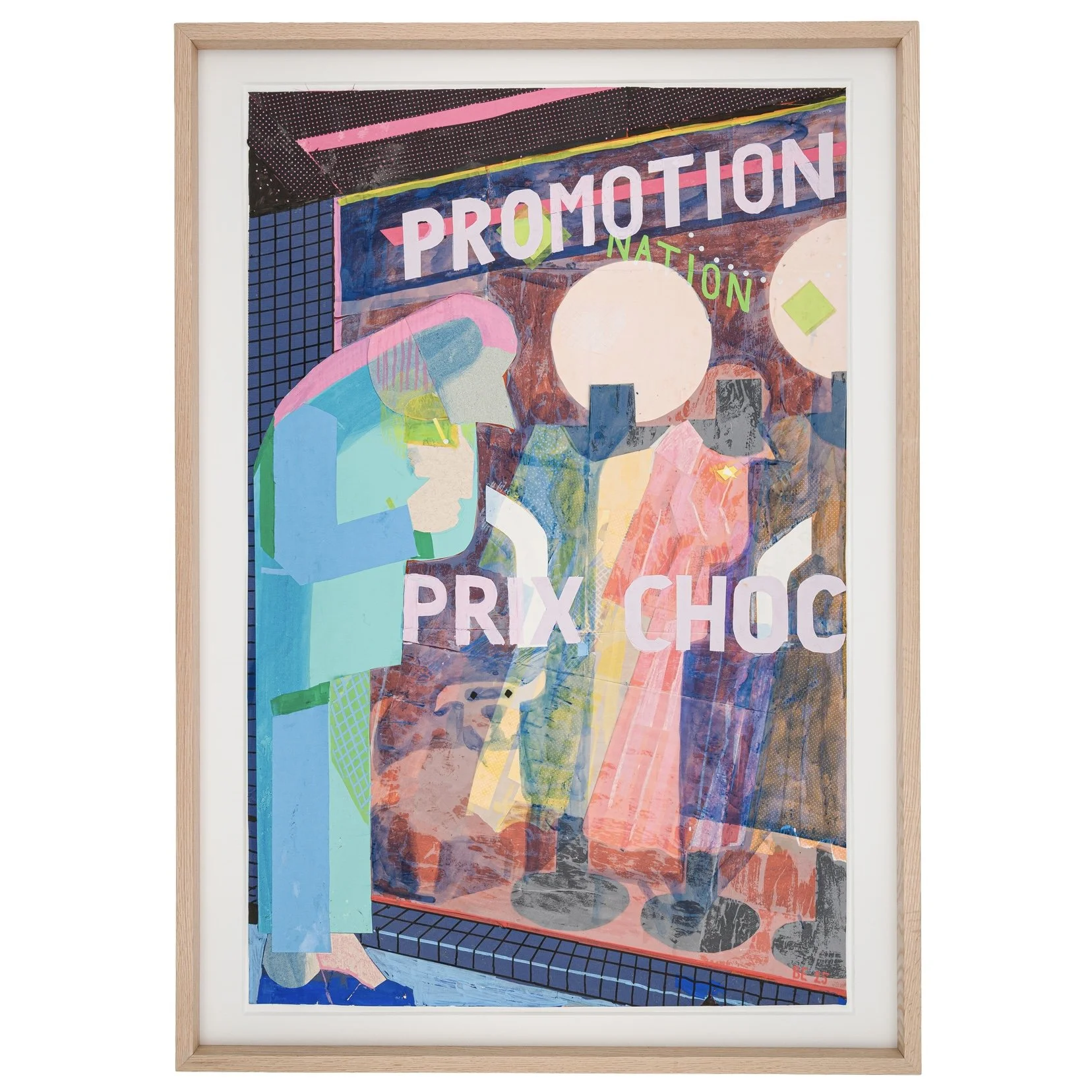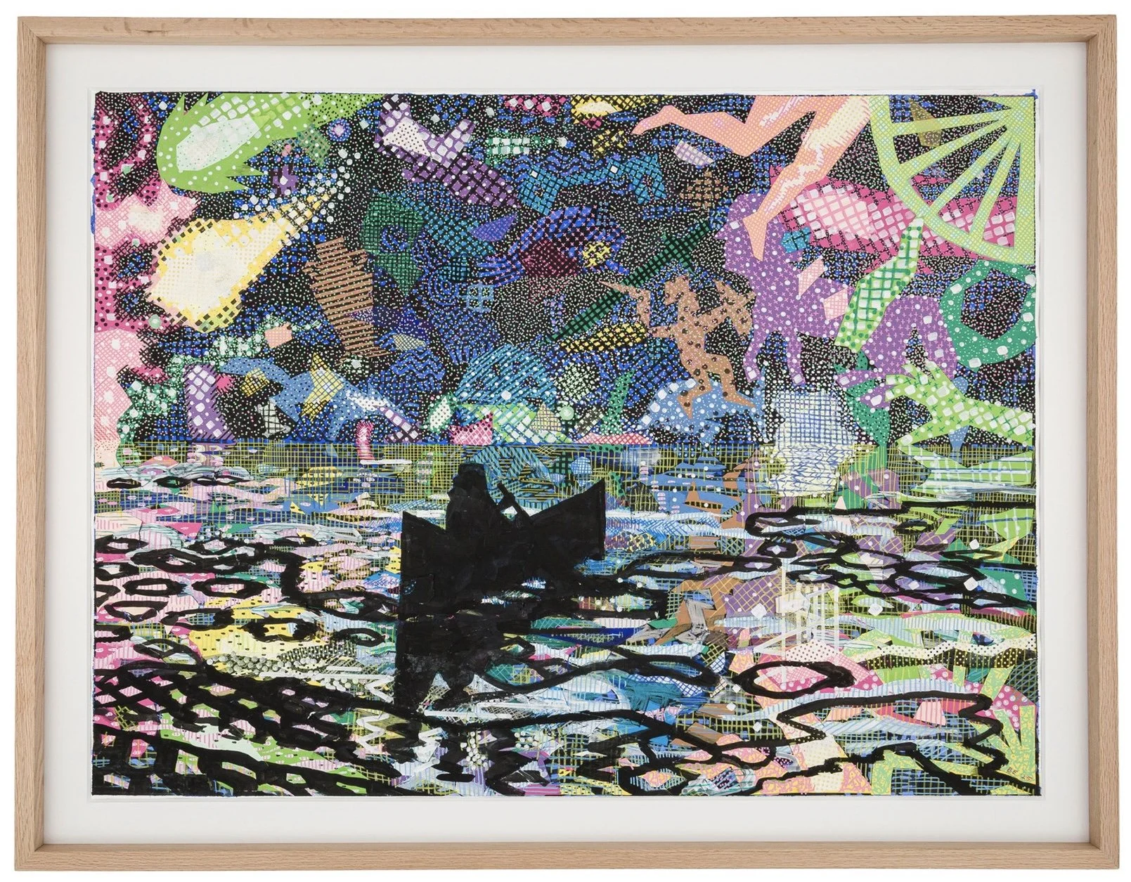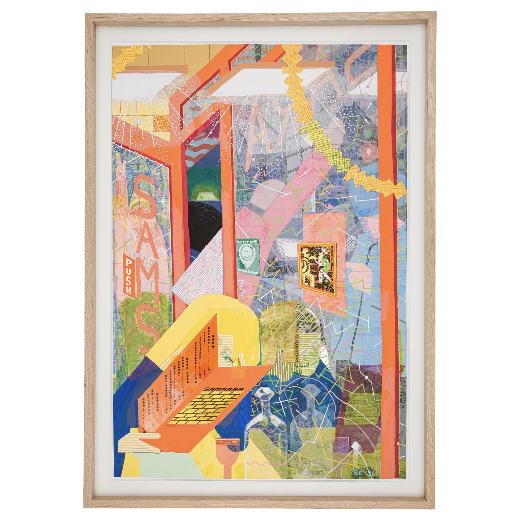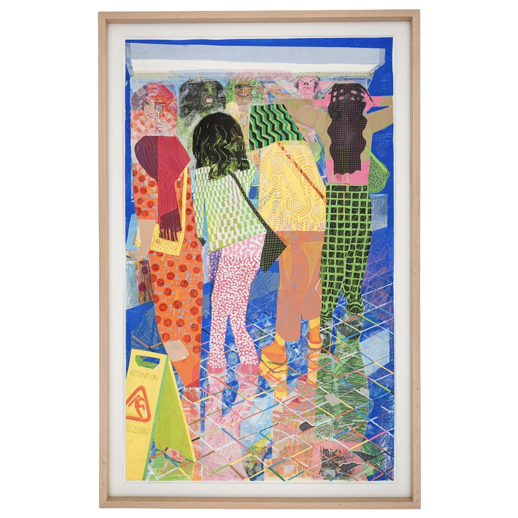 acrylic paint, colored pencils, ink, and collage on paper